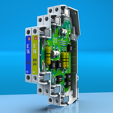 SD系列產(chǎn)品被設(shè)計(jì)為緊湊型的浪涌保護(hù)器,寬度僅為7.1 mm。不同型號的電涌保護(hù)器可用于保護(hù)具有公共參考電位兩線制(非平衡)接口或浮地(平衡)接口。具有高截止頻率(HF)產(chǎn)品可用于高速傳輸數(shù)據(jù)的平衡總線接口(如Profibus,RS485)。